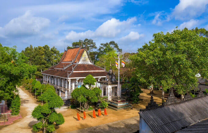 Bao Mon Pagoda, also known as Dom Bon Bak Pagoda, is located in Bao Mon hamlet, Don Chau commune, Tra Cu district, Tra Vinh province. Right from the early days when the Don Chau Commune Party Cell was established, the Party Cell went to Bao Mon Pagoda to build a legal base of operations, to serve as a place to house cadres, and at the same time mobilize monks to establish the Love Increase Committee. The province organized protests against conscription and demanded a reduction in taxes. In 1946 - 1950, through classes, the Party cell propagated the Party's policies, explained the evil plots of the enemy, and educated patriotism and revolutionary spirit for young people. From these classes, many people later became revolutionary officers and soldiers. In 1951, during the raid on Bao Mon hamlet and Mo Coi hamlet, Don Chau commune, the enemy shot dead a number of officials, the head monk of Bao Mon pagoda mobilized Buddhists to bring the cadres' bodies to the pagoda for burial. Later, during a raid by Commendo soldiers, the pagoda took some officials into the towers and the ceiling of the main hall to hide. Many revolutionary cadres in the resistance war against the French were sheltered, sheltered, and sheltered by the pagoda. During the resistance war against the US, Bao Mon Pagoda continued to be a solid base of the revolution. Many secret vaults were made in the temple grounds, under the Buddha altar, on the ceiling of the main hall and right in the eldest monk's room. At the end of 1968, the enemy discovered guerrilla forces stationed at the pagoda, they sent troops to surround it and called for surrender. Faced with that difficult situation, with his acumen, the chief sent the guerrilla squad down to spray water in front of the main hall. Then, with skillful and resolute words, the chief explained to the enemy that this was the place Practicing, as a Khmer, we must respect monks and temples. Faced with the monk's convincing arguments, the enemies could not find evidence and had to retreat in anger. During the Ho Chi Minh campaign to liberate Tra Vinh, monk Kim Toc Chon - Head of the Provincial Transport Committee assigned monk Lam Ruong Son (Bao Mon Pagoda) and monks Son Song, Thach Suong, and Son Sa Ra to the provincial palace. The chief persuaded Nguyen Van Son, governor of Vinh Binh province, to call on the puppet army and puppet government to surrender, contributing to the overall victory of the resistance war against the US. With the spirit of "All for the front line, all for the resistance", Buddhists and monks of Bao Mon pagoda contributed dozens of taels of gold, thousands of bushels of rice and many other items. There were 25 monks and Buddhists who heroically sacrificed their lives for the cause of national liberation. Particularly, the elder monk was awarded the Second Class Resistance Medal and Medal for National Development by the State. Bao Mon Pagoda was recognized by the People's Committee of Tra Vinh province as a provincial historical relic on June 10, 2005. Source: Tra Vinh Tourism Promotion Center