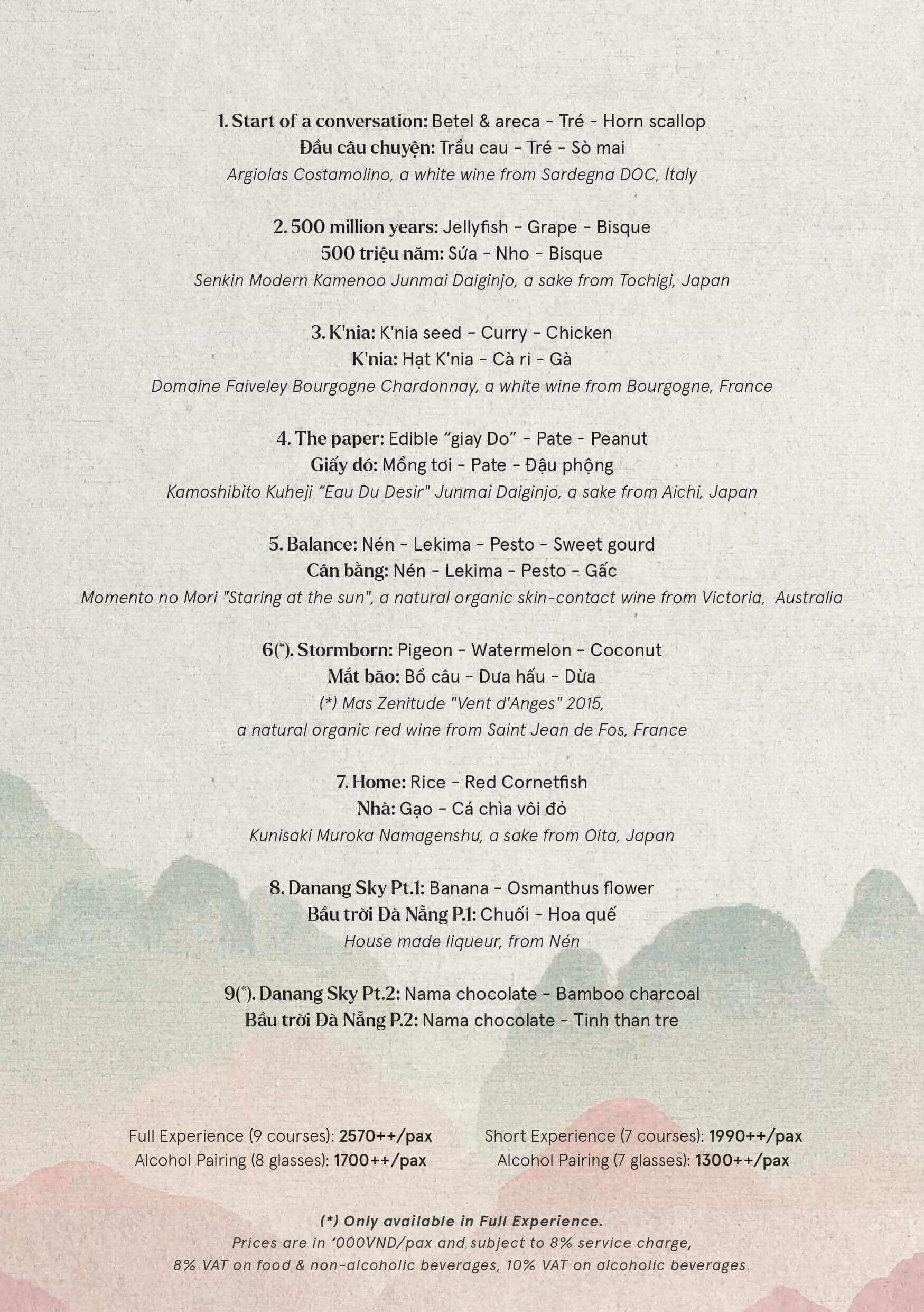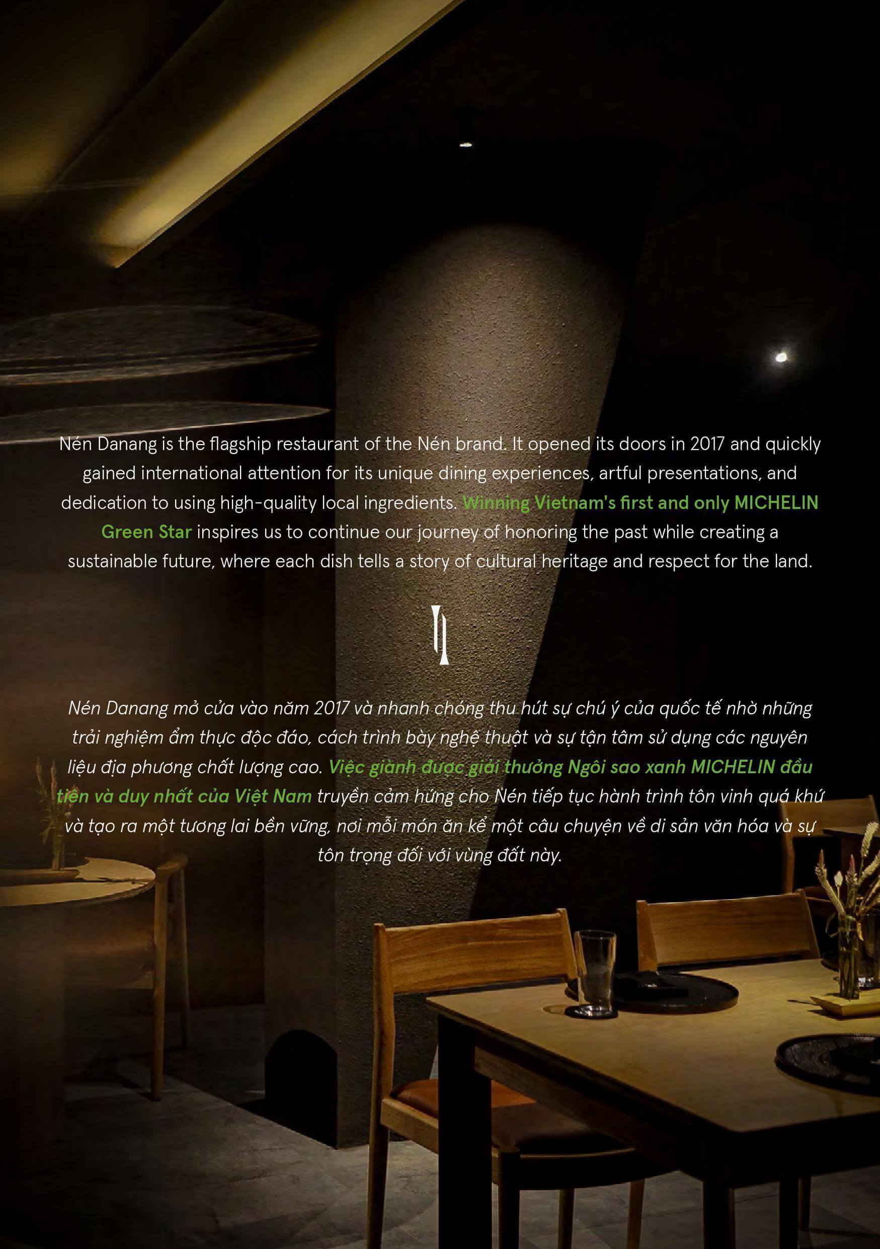 Founded in 2017, Danang compression is a prominent pioneer in modern Vietnamese cuisine. Located in the largest city in Central Vietnam, Danang compression always strives to discover the great potential of Vietnamese raw materials and culture. We tell stories through our dishes, using 99% of local ingredients originating from all over the country and from Farm compression, in order to highlight the quintessence of Vietnamese flavors.