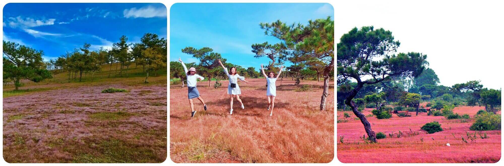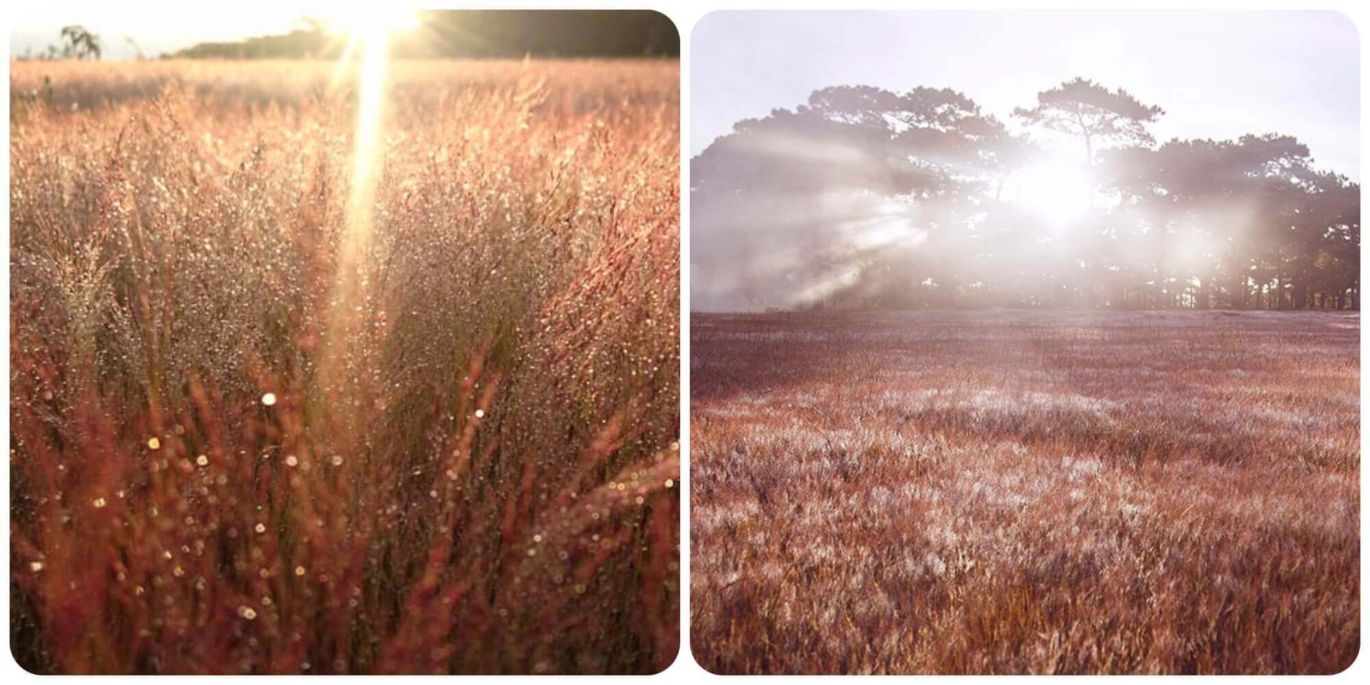 Khung cảnh ấy chẳng khác gì một tuyệt tác nghệ thuật. Những mảng màu được phối hợp hài hòa: sắc hồng miên man của cỏ,nét chấm phá xanh mát của rừng thông ở phía xa,và bầu trời biêng biếc với những tia nắng bình minh dịu dàng. Tất cả như hòa quyện lại,tạo nên một bức tranh thiên nhiên hoàn hảo,khiến tôi ngỡ mình đang lạc vào một miền cổ tích. Đứng giữa khung cảnh ấy,tôi có cảm giác như được quay trở về với nguyên sơ của đất trời,nơi mọi thứ còn giản dị,nguyên bản và tràn đầy sức sống.