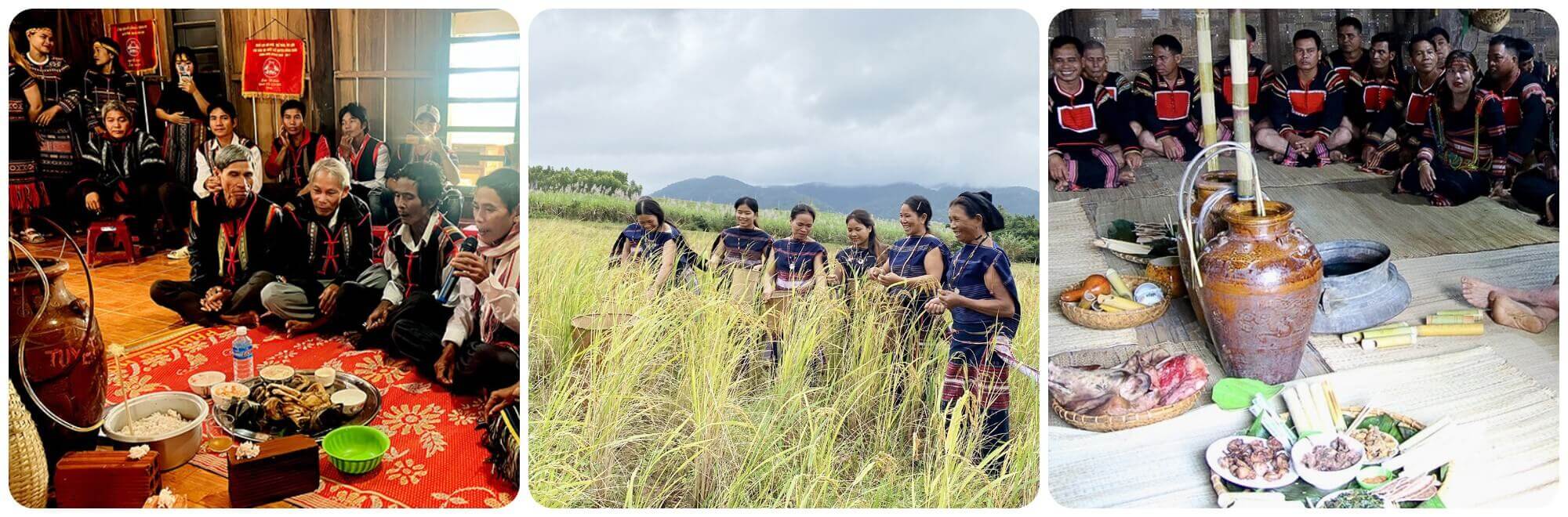Lễ mừng lúa mới được tổ chức không chỉ trên quy mô cả buôn làng mà sau đó còn lan tỏa vào từng nhà,từng hộ gia đình. Đó là một nét đặc biệt của người J'rai và Bahnar - khi mà lễ hội không chỉ là dịp chung của cả làng mà còn là lễ của từng nhà,tạo nên sự gắn kết rất sâu sắc trong cộng đồng. Trong suốt quá trình thu hoạch,già làng sẽ chọn một đám lúa tốt nhất,dành riêng để dâng thần Ia Pôm - vị thần lúa và thần nông nghiệp trong tín ngưỡng của đồng bào. Đây là thời khắc quan trọng,khi cả làng đều tụ họp tại chân ruộng để cùng chứng kiến và tham gia vào nghi thức cúng thần. Lễ vật cúng thần được mỗi nhà đóng góp một chút: một ché rượu cần,một con gà,hay một miếng thịt để tạo nên mâm cúng trang trọng. Trong sự chuẩn bị giản dị ấy,ta thấy được tình cảm gắn bó và sự chân thành của người dân,khi mà từng người,dù là già hay trẻ,đều có nghĩa vụ góp một chút gì đó từ thành quả lao động của mình để chia sẻ cùng cộng đồng.