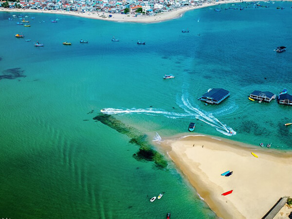 Đặc biệt,nước biển trong vắt có màu xanh ngọc bích huyền ảo kỳ lạ,khi thuỷ triều rút,một gành đá xen lẫn bãi cát dần lộ ra tạo nên con đường biển dài hơn 500m dẫn từ làng chài Nhơn Hải ra tới đảo. Một cực phẩm độc nhất vô nhị.
