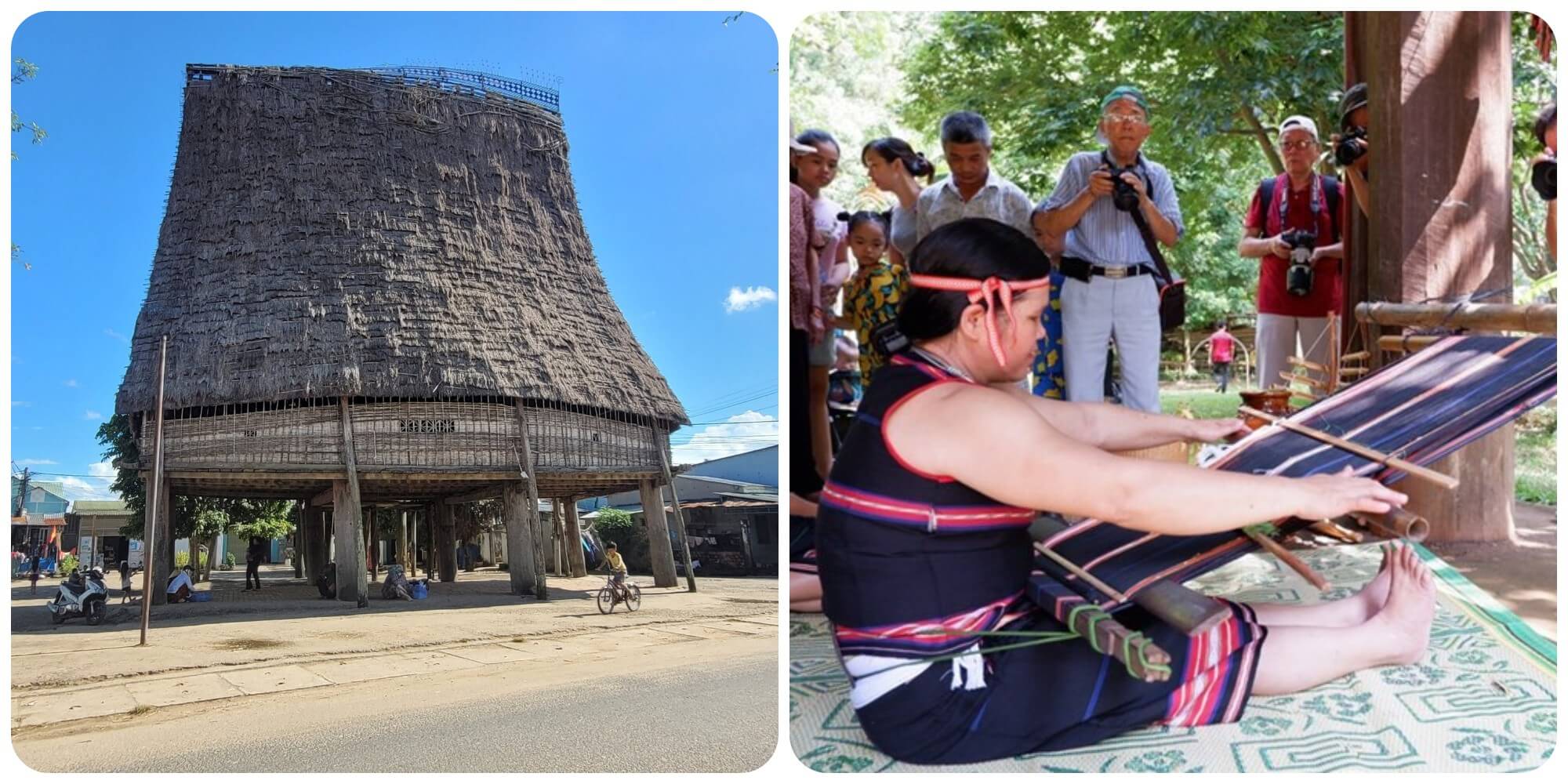 Hoàng hôn buông xuống,mặt trời đang dần lặn sau những đỉnh núi xa xa. Trong những gian nhà sàn,các bà,các mẹ đang cùng ngồi dệt vải,đan lát và làm ra những món đồ thủ công vô cùng tinh tế. Để làm được các việc này chắc chắn cần phải có sự khéo léo,tài hoa từ đôi tay của người phụ nữ Tây Nguyên. Những chiếc gùi,chiếc nón,hay bộ trang phục thổ cẩm đầy màu sắc đều được làm thủ công và gắn liền với cuộc sống sinh hoạt của người dân nơi đây.