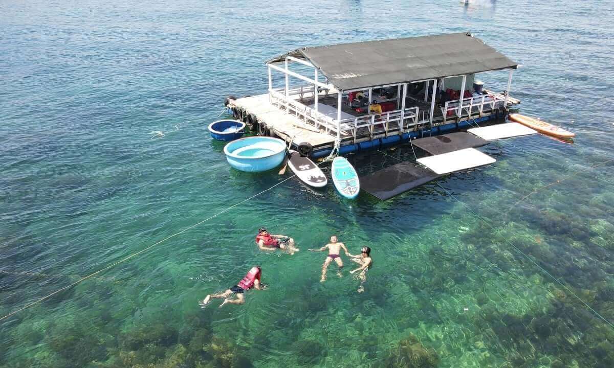 Rời xa phố thị ồn ào,chúng tôi men theo con đường ven biển,băng qua những đồi cát trắng phau,để đến với làng chài Nhơn Hải thanh bình. Nơi đây,cuộc sống cứ êm đềm trôi qua với những chiếc thuyền neo đậu san sát,những mái nhà đơn sơ nép mình bên bờ biển. Hít hà hương vị mặn mòi của biển cả,lòng người bỗng thấy nhẹ nhàng,thanh thản đến lạ. Từ bến tàu Nhơn Hải,chiếc cano nhỏ đưa chúng tôi rẽ sóng ra khơi. Cảm giác lênh đênh trên biển,gió biển mơn man da thịt,ngắm nhìn những con sóng bạc đầu nô đùa,khiến bao muộn phiền trong lòng tan biến hết.