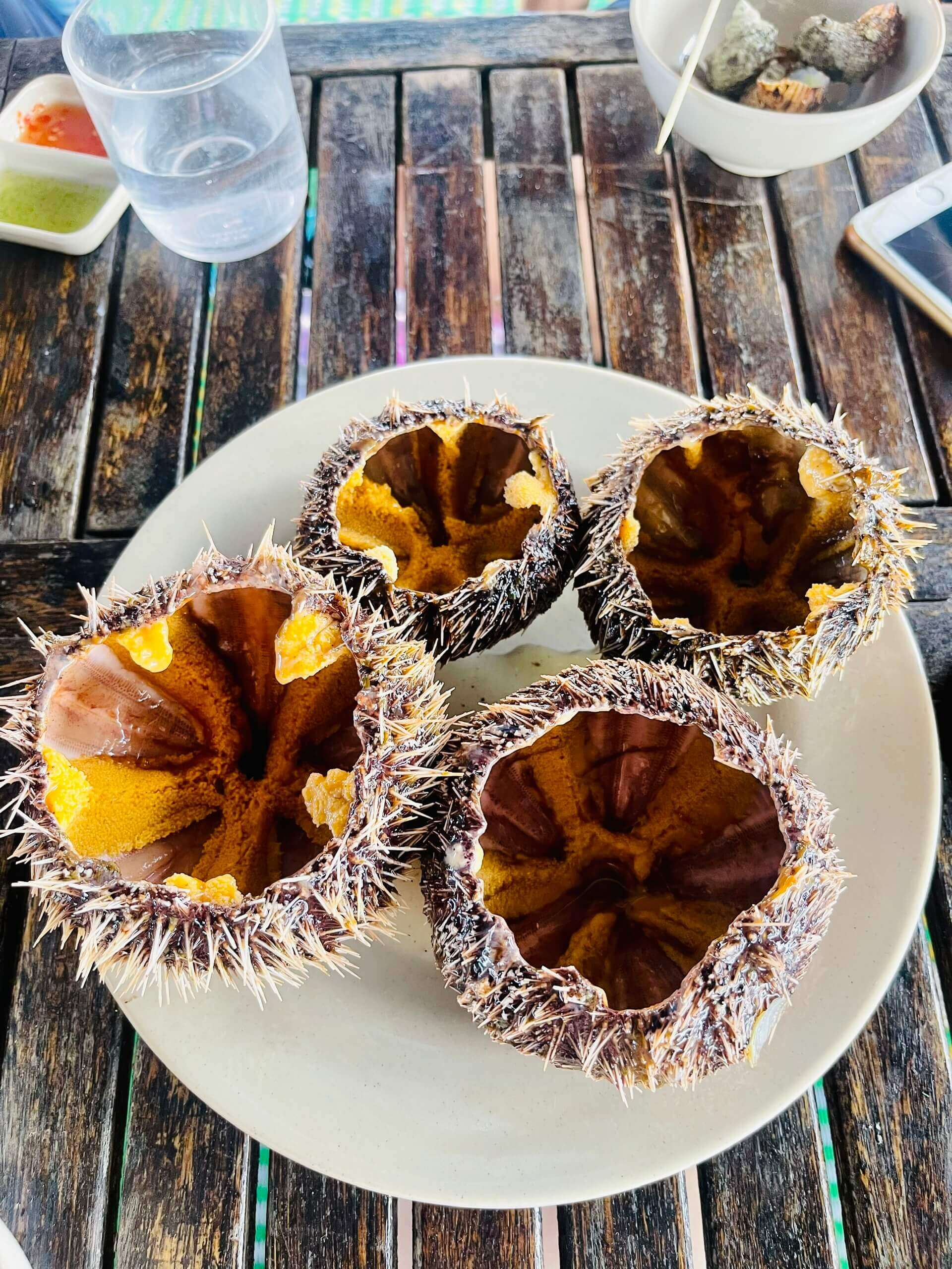 Trên đảo,chúng tôi được thưởng thức những món hải sản tươi ngon,đậm đà hương vị biển. Cua huỳnh đế,tôm hùm,ốc vú nàng,nhím biển... được chế biến theo phong cách dân dã,khiến ai cũng phải tấm tắc khen ngon.