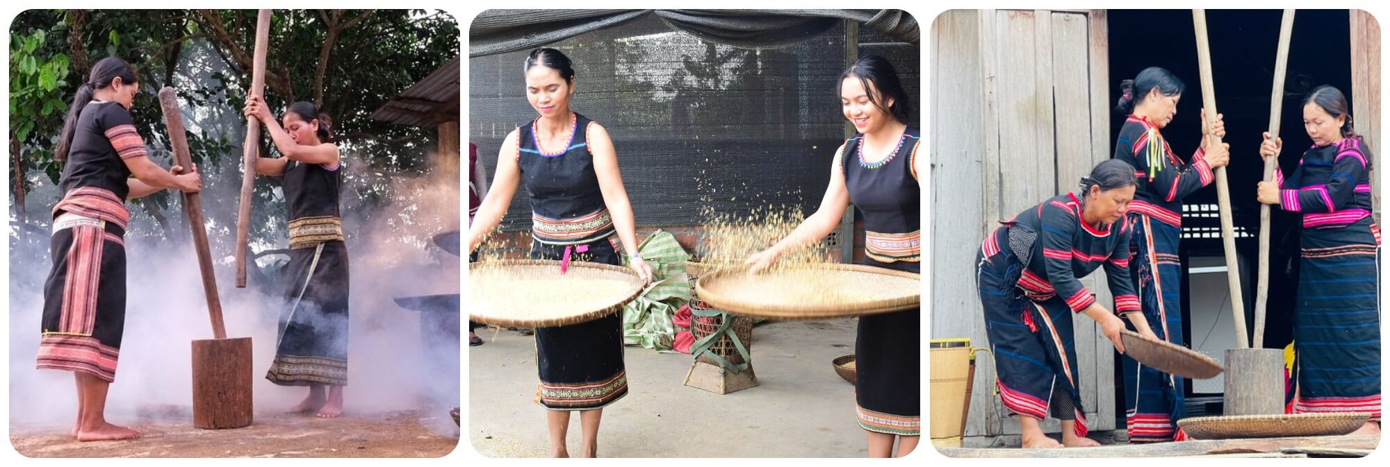 Nhưng để giã được những hạt gạo trắng ngần,không vỡ vụn,đòi hỏi sự khéo léo và kỹ thuật của người phụ nữ Jrai. Đôi tay chai sạn vì công việc đồng áng vẫn đầy uyển chuyển,họ điều chỉnh nhịp chày sao cho hạ xuống đúng lúc,đủ lực để tách vỏ trấu mà không làm nát gạo. Trên chiếc cối gỗ,hai người thay nhau nhịp chày lên xuống,như thể từng động tác đã ăn sâu vào máu thịt,trở thành một phần của đời sống thường nhật.