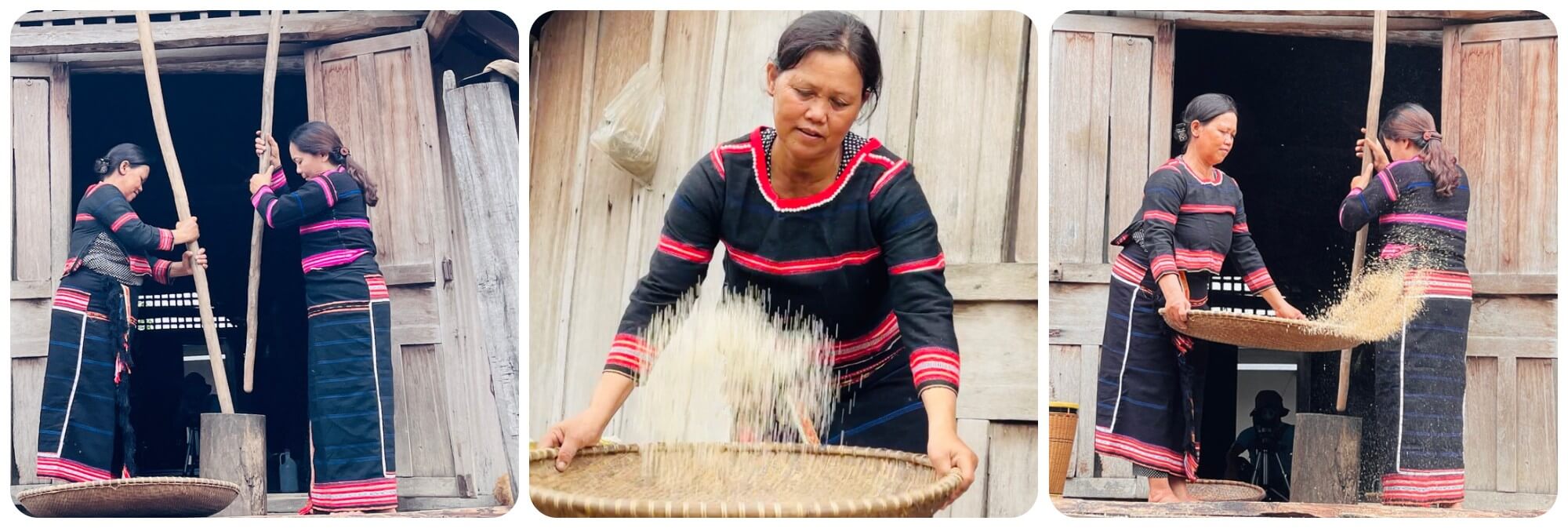 Sau những nhịp chày giã gạo,đôi bàn tay khéo léo của họ lại tiếp tục với công việc sàng sảy. Từng cái lắc tay nhẹ nhàng nhưng dứt khoát khiến cả lúa,thóc và trấu như những lớp sóng cuộn lên trên tấm nia tre. Dưới ánh sáng ban mai,những hạt gạo trắng đục lấp lánh ánh ngọc,như kết tinh của sự cần cù,khéo léo và tình yêu dành cho đất mẹ. Khi những chiếc gùi đã đầy gạo,người phụ nữ Jrai lại tiếp tục công việc thường ngày,nhưng nhịp chày ấy vẫn còn ngân vang mãi trong không gian làng quê như một khúc hát không lời kể lại câu chuyện của một đời sống gắn bó với mảnh đất này.