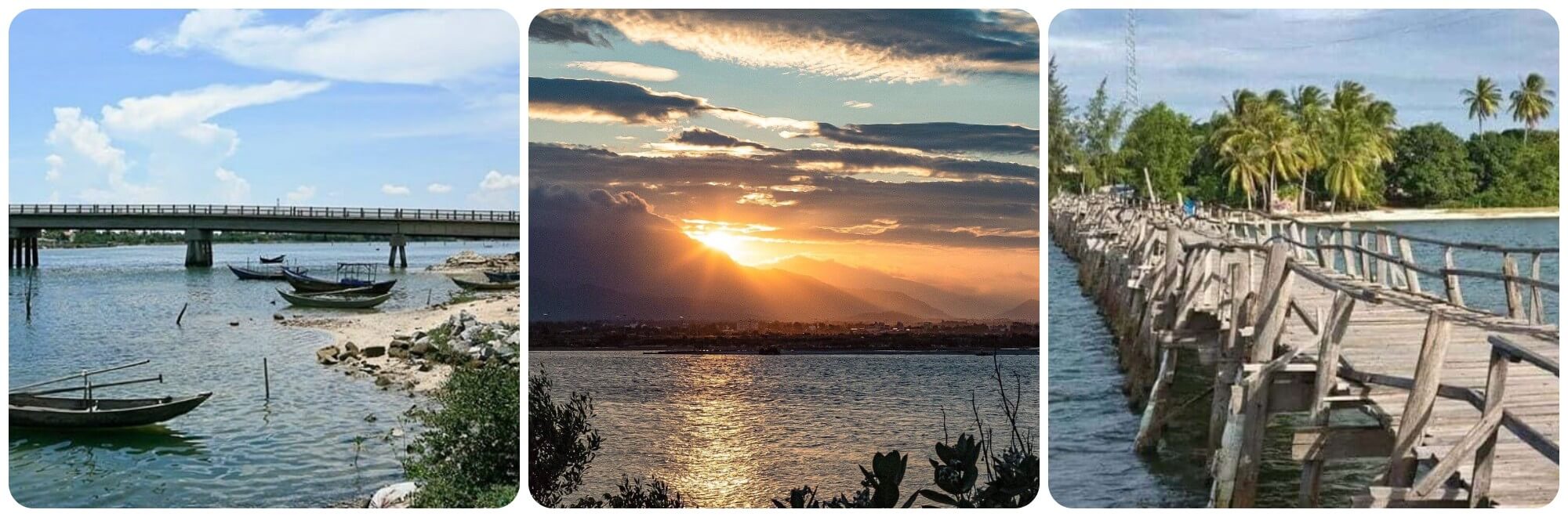 Điểm dừng chân đầu tiên của tôi là Cầu Mới,cây cầu bắc ngang đôi bờ đầm Thủy Triều. Từ trên cầu,tôi phóng tầm mắt ngắm nhìn toàn cảnh vùng sông nước trù phú trải dài đến tận chân trời. Gió biển mát lành phả qua khiến tôi cảm nhận rõ rệt hơi thở của thiên nhiên hoang sơ,dịu dàng. Hai bên bờ,rừng đước xanh ngát trải dài như tấm thảm thiên nhiên mềm mại,tạo nên khung cảnh đầy chất thơ. Nhìn những mái chèo nhẹ nhàng khua nước,từng nhịp sống chậm rãi nơi đây dường như càng làm tôi thêm say mê.