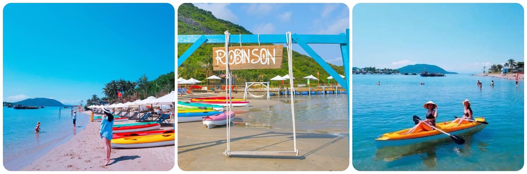 Một trong những trải nghiệm không thể bỏ qua khi đến đây là chèo thuyền kayak. Đảo Robinson sở hữu một hồ nước trong xanh như ngọc,sóng vỗ nhẹ nhàng,cực kỳ lý tưởng cho môn thể thao này. Du khách có thể tự do chèo thuyền,khám phá những góc khuất đầy bí ẩn của hòn đảo mà ít ai biết đến. Nếu bạn là người yêu thích khám phá và mạo hiểm,đây chính là cơ hội để bạn tự do thám hiểm,tận hưởng không gian yên bình và tìm thấy những khoảnh khắc tuyệt vời giữa thiên nhiên. Đặc biệt,bạn có thể dễ dàng thuê các trang thiết bị phục vụ cho những chuyến đi của mình,từ thuyền kayak đến áo phao,mái chèo,tất cả đều có sẵn để bạn sẵn sàng cho cuộc phiêu lưu. Chỉ với khoảng 100.000đ đến 200.000đ cho mỗi thuyền,bạn sẽ có 2 giờ đồng hồ tự do khám phá làn nước trong xanh của đảo.