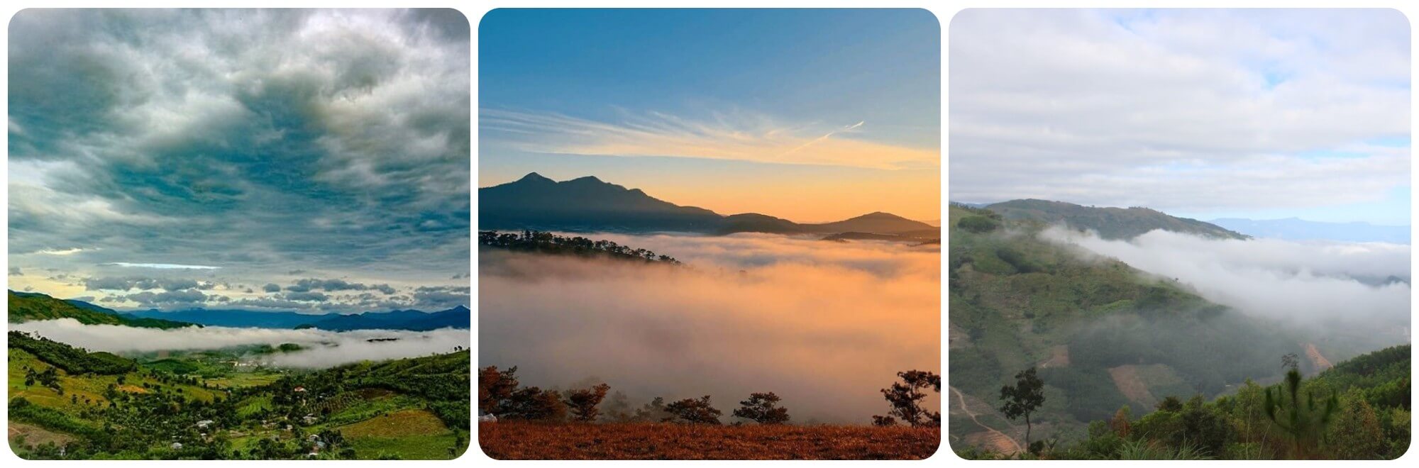 Những tia nắng đầu tiên trong ngày vừa kịp vén màn sương sớm,kéo mây xuống thung lũng tạo nên một khung cảnh huyền ảo như tranh vẽ. Mây trắng tràn ngập khắp nơi,ôm lấy những quả đồi phủ đầy rừng cây xanh ngát,lững lờ trôi qua các nóc nhà nhỏ xinh và nhẹ nhàng quấn quanh những khu vườn trái cây trĩu quả. Trong khoảnh khắc ấy,tôi như cảm nhận được hơi thở của đất trời – mây mềm mại đón ánh nắng len qua từng kẽ lá,bung ra những tia sáng vàng tươi rực rỡ,làm bừng lên sức sống của cả một vùng đất.