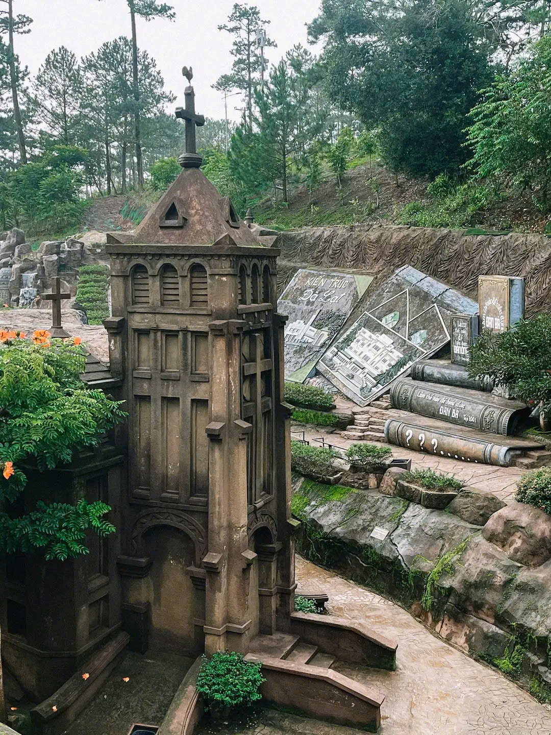 Điều đặc biệt là toàn bộ công trình không sử dụng bê tông hay xi măng, mà hoàn toàn làm từ đất đỏ bazan pha trộn phụ gia để tăng độ kết dính. Trên hành trình dài gần 2km, du khách sẽ thấy những công trình mô phỏng ga Đà Lạt, nhà thờ Con Gà, chùa Linh Sơn, thậm chí cả hình ảnh Việt Nam qua các thời kỳ. Đi giữa những bức tường đất sét đỏ, bạn sẽ có cảm giác như đang bước vào một bảo tàng điêu khắc khổng lồ ngoài trời.