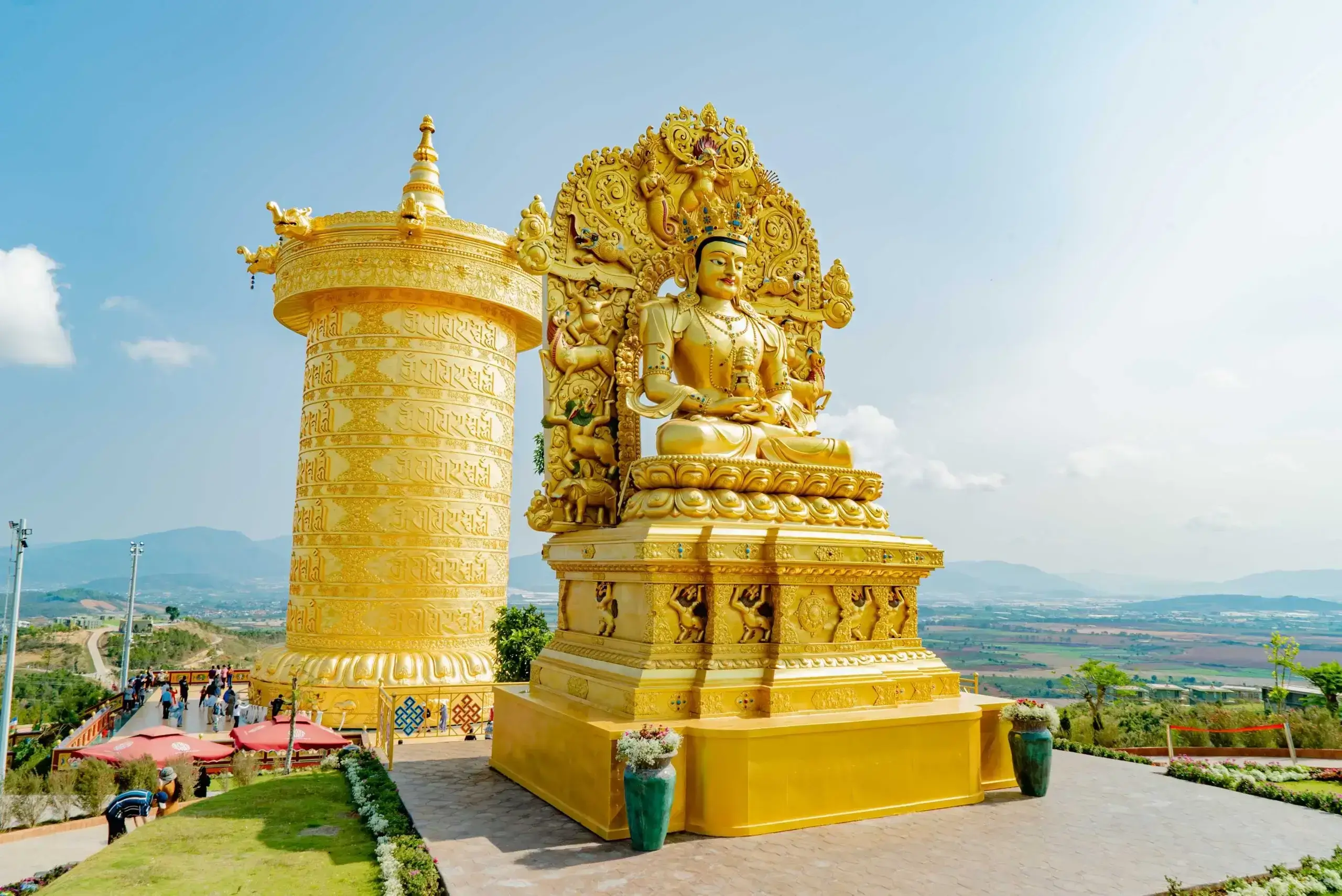 Đại bảo tháp kinh luân là công trình tự hào của Samten Hills Dalat nói riêng và Việt Nam nói chung – Đại Bảo Tháp Kinh – “Drigung Kagyu Rinchen Khorchen Khorwe Go Gek,bánh xe cầu nguyện lớn nhất thế giới. Đại bảo tháp kinh luân nặng 200 tấn,được làm bằng đồng tinh khiết và dát vàng. Bên trong bánh xe cầu nguyện chứa 1 tỷ câu thần chú cát tường được in trên giấy lụa,nhận sự gia trì của các vị tôn sư cao quý với ước nguyện mang đến bình an,may mắn và hạnh phúc cho tất cả chúng ta.
