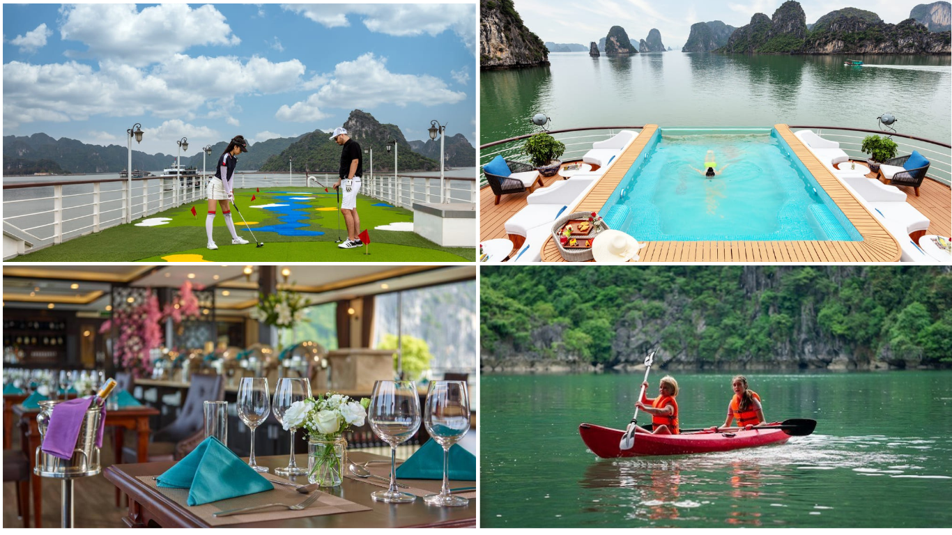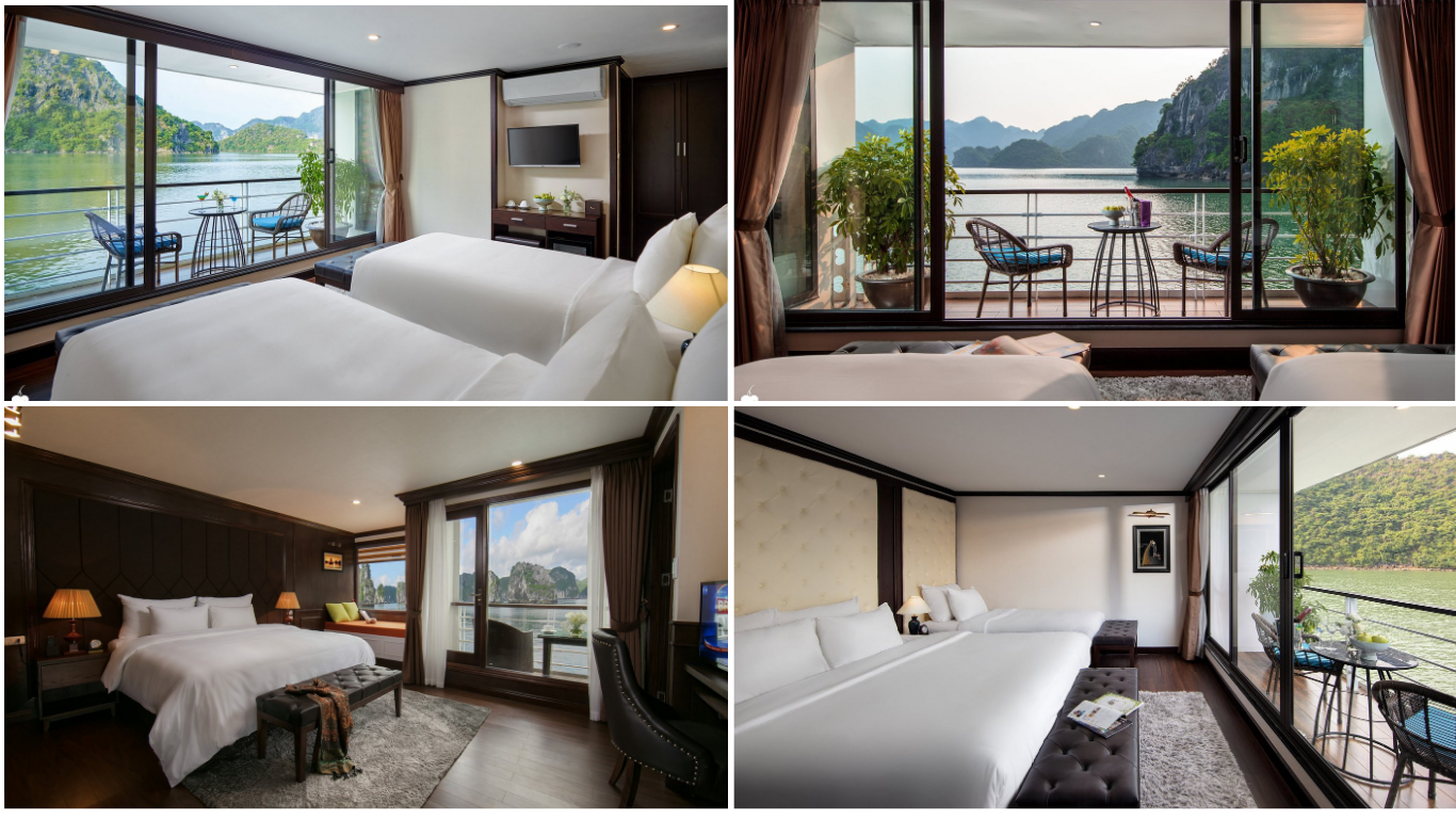 Ngoài phòng tiêu chuẩn,du thuyền còn có các hạng phòng cao cấp dành cho khách yêu thích sự riêng tư. Một số phòng được trang bị bồn tắm hiện đại hoặc khu ghế mát-xa để bạn phục hồi năng lượng. Nhiều du khách đánh giá cao sự yên tĩnh của không gian này,đặc biệt vào ban đêm khi vịnh chìm trong ánh trăng. Sự kết hợp giữa tầm nhìn biển và tiện nghi mang lại trải nghiệm nghỉ dưỡng đẳng cấp.