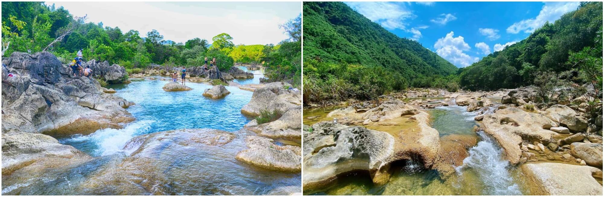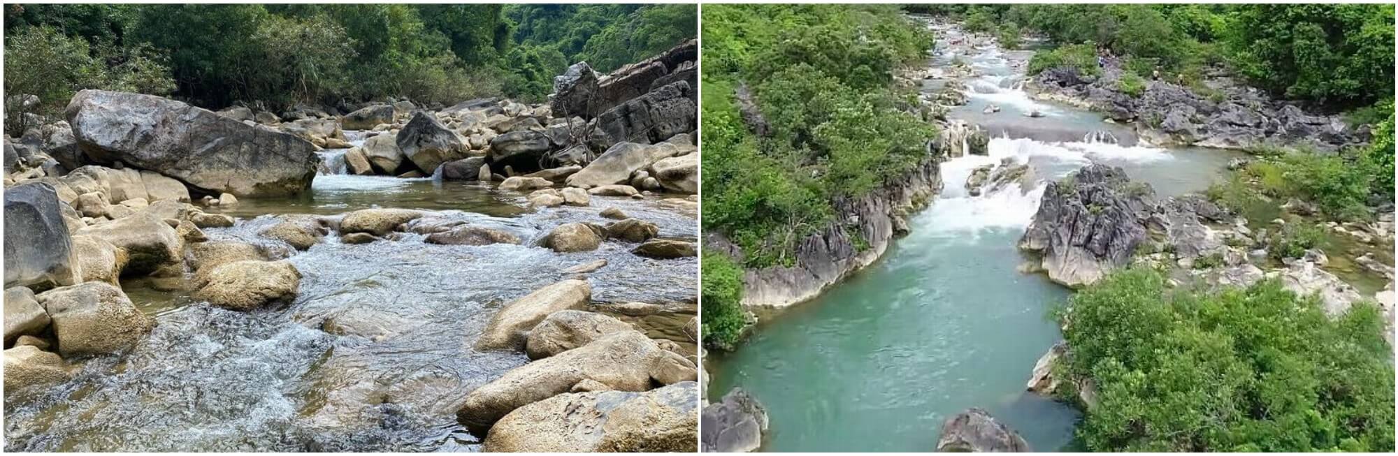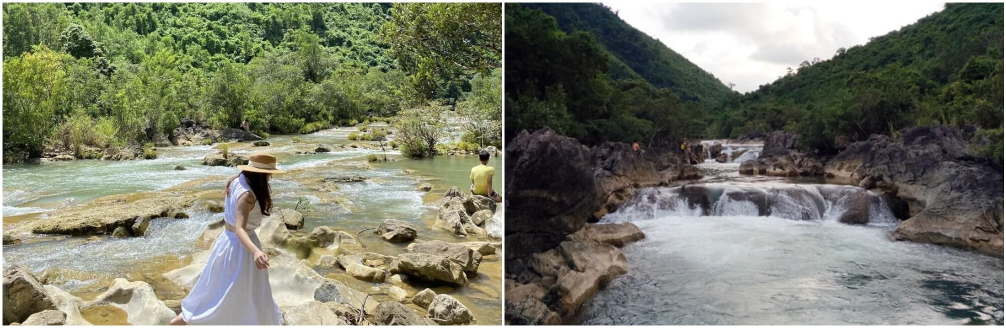Trên những ghềnh đá nhỏ nằm giữa dòng suối chảy róc rách,du khách có thể dừng chân,tạo dáng và để dòng nước mơn man quanh chân. Những triền dốc thoai thoải,điểm xuyết bởi sắc xanh của cỏ cây là chốn lý tưởng để bạn phóng tầm mắt ra xa,nơi bầu trời như ôm trọn lấy núi rừng.