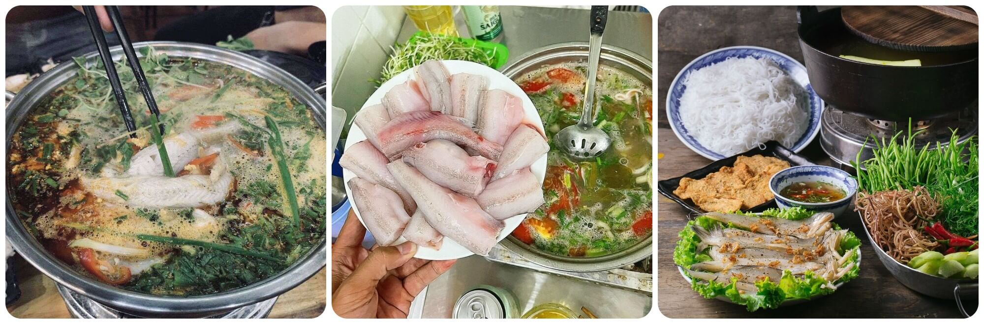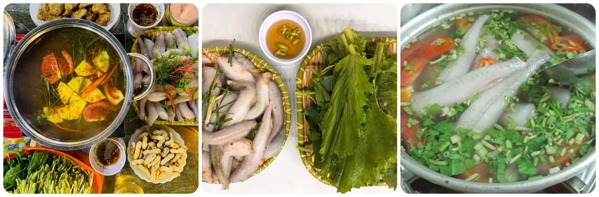 Khi nồi lẩu sôi lăn tăn,những lát cá khoai trắng ngần được thả vào,chỉ vừa chín tới để giữ nguyên độ ngọt tự nhiên,dai nhẹ và không bị nát. Những món rau kèm như hoa chuối,cần tây,cải xanh hay lá tía tô được nhúng vào nước lẩu,hòa quyện với vị chua thanh của nước dùng,mang lại trải nghiệm ẩm thực không thể quên. Thêm vào đó,bát nước mắm cốt với chút ớt cay nồng làm gia tăng hương vị,khiến mỗi miếng cá như tan ra trên đầu lưỡi,đậm đà đến khó cưỡng.