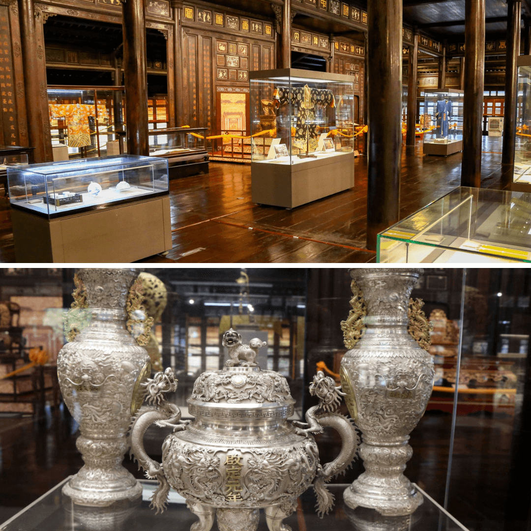 Bảo tàng Cổ vật cung đình Huế là nơi lưu giữ những dấu ấn vàng son của một thời kỳ huy hoàng dưới triều Nguyễn. Những hiện vật trong bảo tàng không chỉ mang giá trị nghệ thuật mà còn là biểu tượng của sự thịnh vượng và quyền lực của triều đại này. Bộ sưu tập trang phục hoàng gia là một trong những điểm nhấn nổi bật,với những bộ áo dài,áo choàng được thêu tay tỉ mỉ và sử dụng chất liệu vải cao cấp. Những món đồ này không chỉ đơn thuần là vật dụng sinh hoạt,mà còn là những vật phẩm thể hiện quyền uy của các bậc vua chúa.