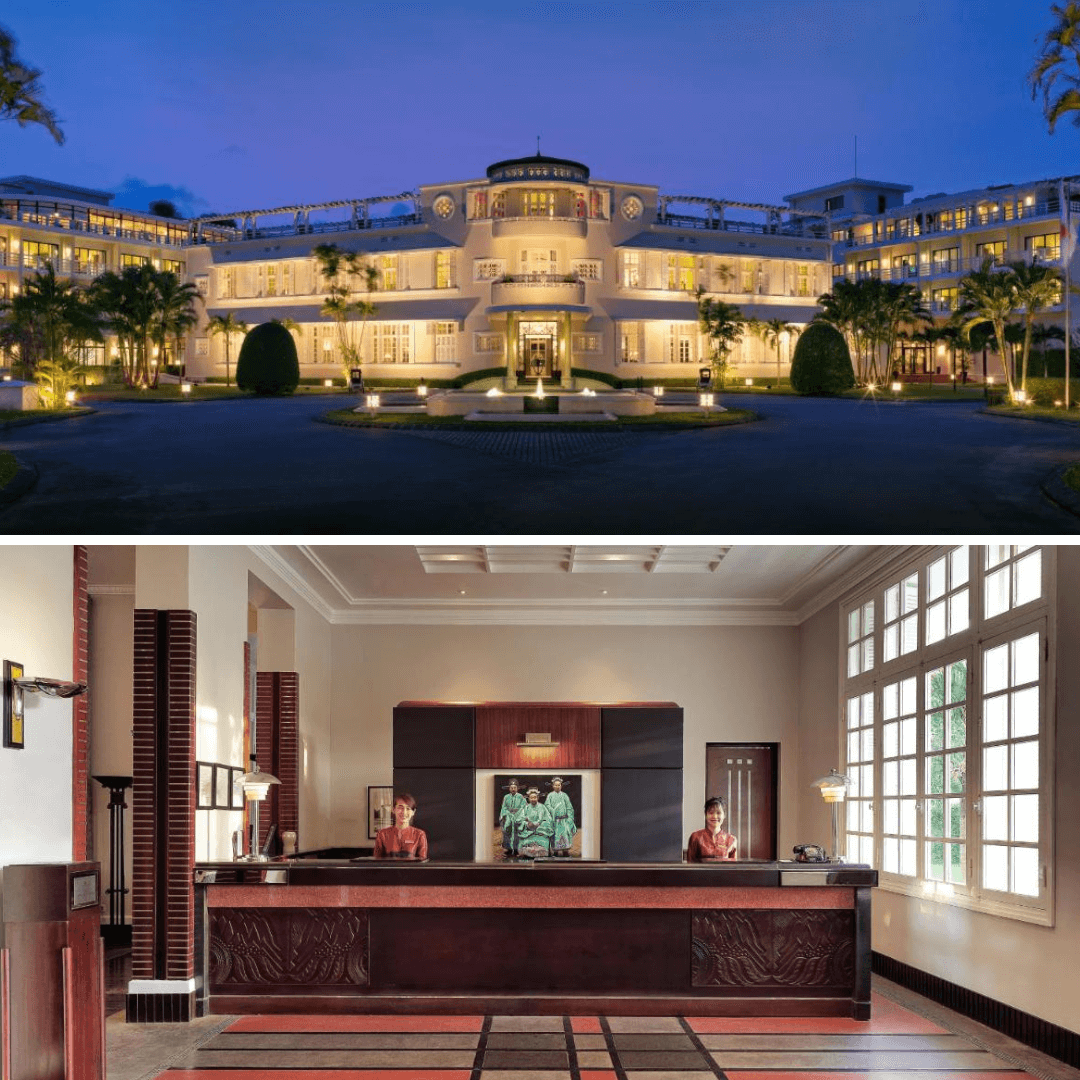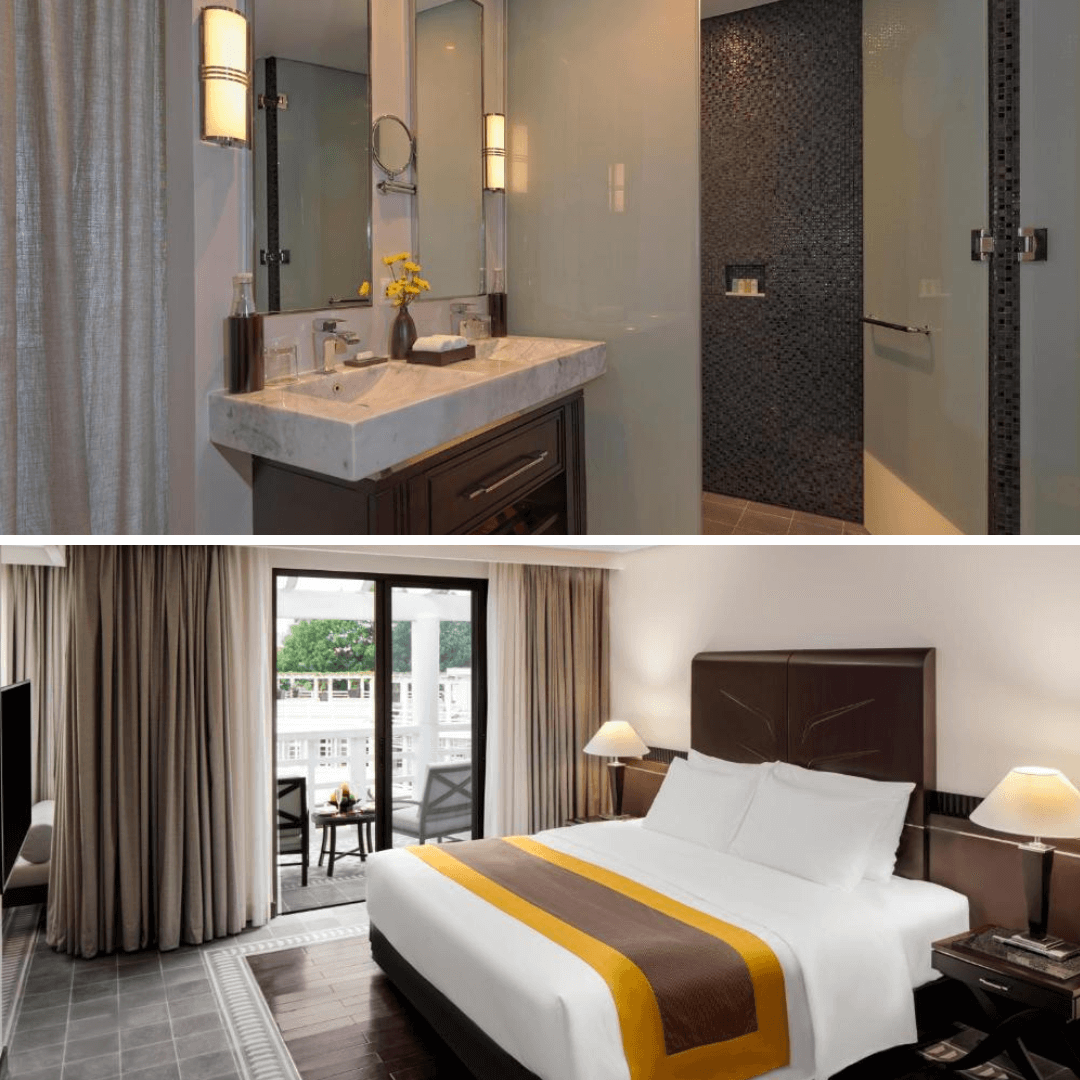 Nguyên bản dinh thự Thống Đốc Pháp xây dựng năm 1930 được Azerai giữ nguyên khung vòm,trụ cột và façade cong đặc trưng của Art Deco. Khi bước vào sảnh chính,mình cảm nhận được vẻ sang trọng pha chút hoài niệm,như lạc vào một bảo tàng mini trưng bày đồ nội thất cổ. Hai dãy nhà cánh mới xây sau này được thiết kế đồng điệu,hài hòa về tỷ lệ,vật liệu và tông màu kem trắng. Dãy hành lang dài rợp bóng cây và tường rêu phong gợi nhớ phong cách Đông Dương xưa. Mình rất thích chi tiết tay vịn gỗ và tay nắm cửa bằng đồng,tạo nên điểm nhấn tinh tế cho toàn bộ không gian.