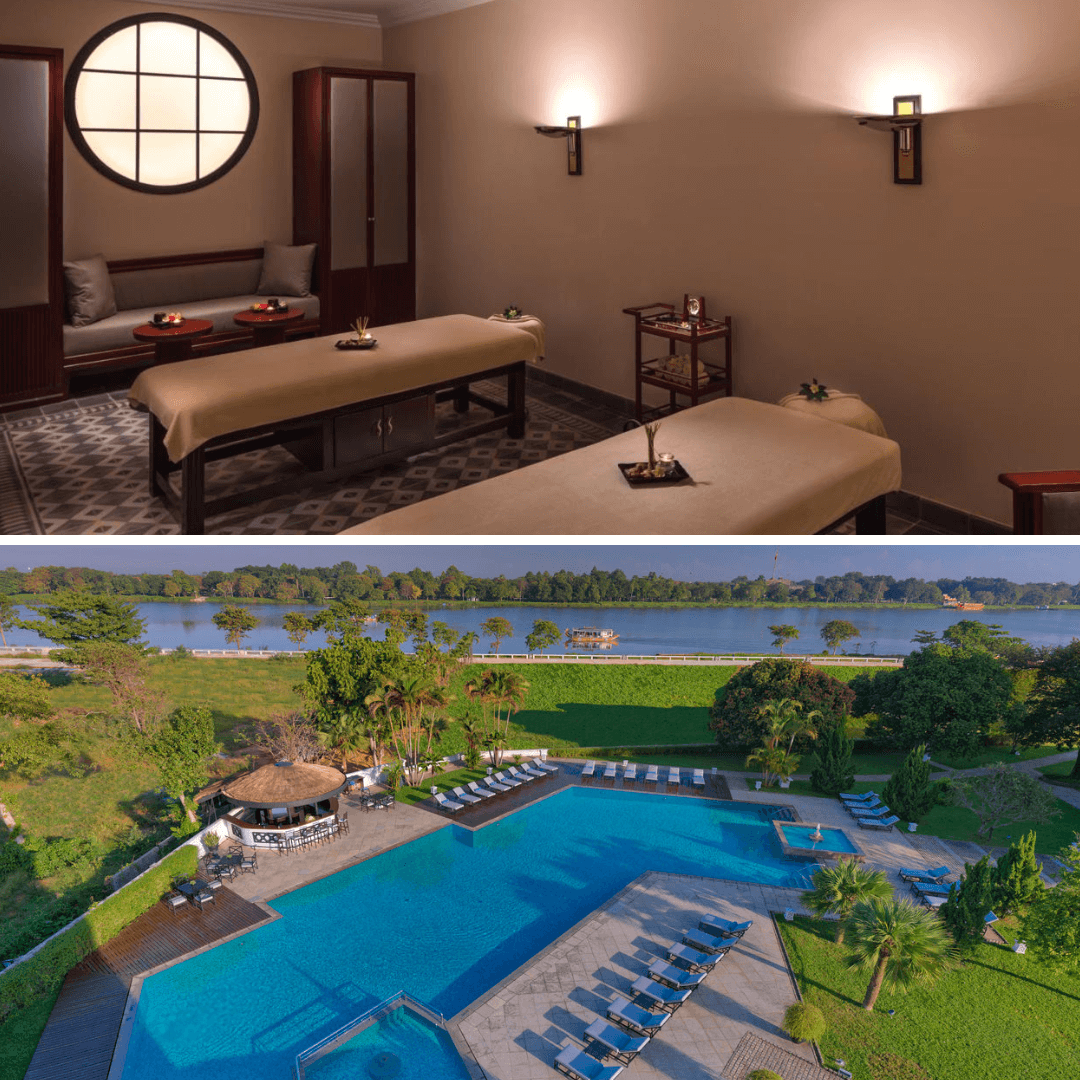 Azerai La Residence,Huế tọa lạc bên bờ sông Hương tại số 5 đường Lê Lợi,phường Vĩnh Ninh,là điểm dừng chân lý tưởng khi mình muốn tận hưởng không gian yên bình giữa lòng thành phố. Khu nghỉ dưỡng gây ấn tượng với diện tích rộng rãi,nhiều mảng xanh và lối kiến trúc Art Deco pha trộn tinh tế giữa cổ điển và hiện đại. Mình nhận thấy mọi chi tiết từ hành lang lát gạch terrazzo đến hoa văn cửa vòm đều được chăm chút tỉ mỉ.