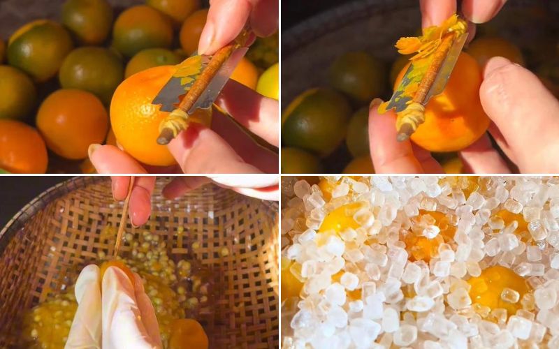 Sau khi sơ chế,quả quất được ngâm vào nước vôi trong để giữ độ giòn và tránh bị mềm nhũn khi sên đường. Quá trình này yêu cầu người làm phải kiểm soát thời gian chính xác để quả không bị quá cứng hoặc mất hương vị. Tiếp theo,quả được chần qua nước sôi rồi ngâm với đường,sên nhỏ lửa cho đến khi đường kết tinh bám quanh quả. Mình thấy công đoạn này là phần quan trọng nhất để tạo nên vị ngọt ngào và màu sắc trong suốt đẹp mắt của mứt.