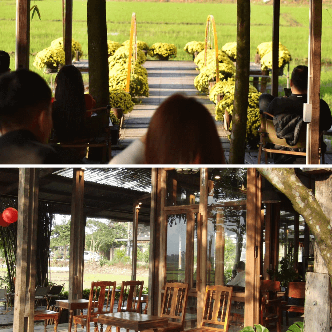 Mình ấn tượng nhất với khuôn viên rộng mở,nơi bạn có thể nhìn thẳng ra những ruộng lúa mơn mởn phía xa. Gió nhẹ thường xuyên lùa qua các kẽ lá,mang theo mùi hương đồng quê rất riêng. Những khung cửa kính lớn dạng trượt liên kết phòng trong và ngoài,giúp không gian bên trong luôn thoáng đãng. Ngồi ở đây,mình có cảm giác như đang lạc giữa một miền quê thanh bình chứ không phải giữa phố thị.
