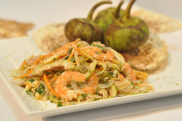 Khi bày ra đĩa,món vả trộn trông rất bắt mắt với màu trắng xanh của vả xen lẫn sắc hồng của tôm và điểm vàng của đậu phộng. Món này có thể ăn kèm bánh tráng mè nướng để tăng vị giòn và thơm. Khi cắn miếng bánh tráng cuộn vả trộn,từng vị bùi,ngọt và thơm hòa vào nhau tạo cảm giác tròn vị. Đó chính là lý do mình mê món này ngay lần đầu thưởng thức.
