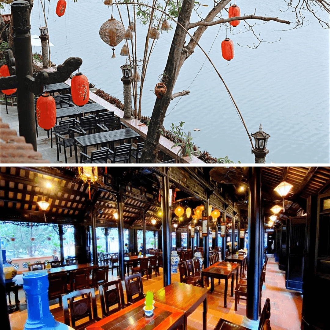Không gian ở đây rộng rãi và được bài trí hài hòa,khiến cho khách đến thưởng thức như được hòa mình vào thiên nhiên và nét văn hóa Huế. Ánh sáng dịu nhẹ cùng các chi tiết trang trí mang đậm phong cách cung đình xưa giúp không gian trở nên ấm cúng. Mỗi góc nhỏ đều có sự chăm chút tỉ mỉ,tạo ra một trải nghiệm gần gũi mà sâu lắng. Chính sự hòa quyện giữa thiên nhiên và kiến trúc truyền thống đã khiến mình cảm thấy thư giãn và dễ chịu.