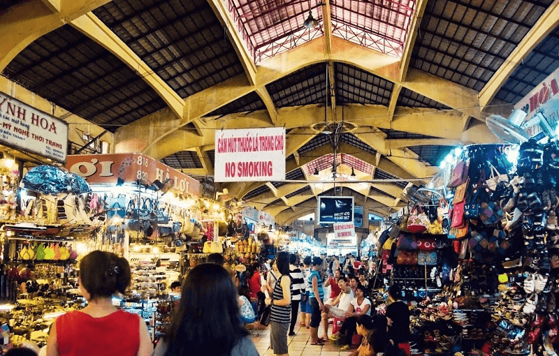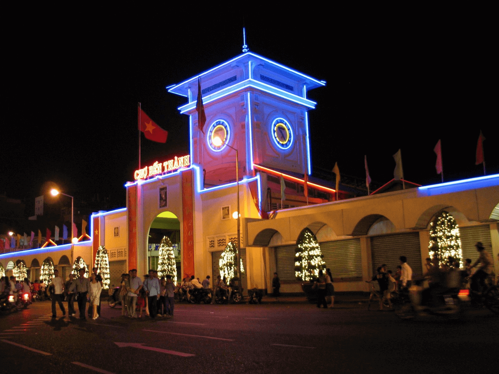 Bến Thành market nằm ở trung tâm quận 1, khu vực đông đúc và hoa lệ bậc nhất Sài Thành. Nằm gần nhiều điểm du lịch Sài Gòn nổi tiếng như Dinh Độc Lập, Bưu điện thành phố, Nhà hát thành phố… và nhiều khách sạn 5 sao cao cấp nên chợ Bến Thành thu hút rất đông du khách ghé đến. Chợ Bến Thành hình thành giữa thế kỷ 19. Trải qua thăng trầm của lịch sử, khu chợ này từ lâu đã trở thành biểu tượng cho văn hóa mua bán sôi động của Sài Gòn nói riêng và Việt Nam nói chung. Cùng với sự phát triển kinh tế, du lịch của Thành phố Hồ Chí Minh, khu chợ này cũng ngày càng nổi tiếng và đặc biệt thu hút đông đảo khách du lịch nước ngoài ghé đến tham quan. Người Việt Nam không xa lạ với những khu chợ đông đúc, nhộn nhịp. Nhưng với người nước ngoài thì đây lại là một nét văn hóa rất riêng. Vì vậy, khách du lịch ngoại quốc rất thích đến chợ mua sắm những món quà lưu niệm, thử món ăn đặc sản Việt Nam. Dần dần, Bến Thành trở thành biểu tượng nổi bật của Sài thành, khiến ai đến thành phố này cũng muốn một lần ghé qua. Chợ Bến Thành ban đầu được xây dựng vào thế kỷ 17 gần sông Bến Nghé để chào đón du khách và binh lính vào Thành Gia Định. Đó cũng là lý do vì sao chợ được đặt tên là Bến Thành (bến sông + thành trì). Chợ được làm bằng vật liệu gạch, gỗ và mái tranh. Chợ Bến Thành xưa rất đông đúc, nhộn nhịp, hàng hóa ghe xuồng tấp nập ngày đêm. Sau thời gian dài sử dụng, chợ dần xuống cấp, có nguy cơ sụp đổ bất cứ lúc nào. Vì vậy nên người Pháp đã cho xây dựng lại và mở rộng quy mô hơn sau khi lấp một ao sình mang tên Bồ Rệt. Từ năm 1912, phải mất thêm 2 năm, nhà thầu thi công Brossard et Maupin của Pháp mới hoàn thành công trình này. Các kiến trúc cũ từ đó vẫn được bảo toàn cho đến ngày nay dù chợ Bến Thành đã trải qua một cuộc cải tạo và sửa chữa lớn vào năm 1985. Chợ Bến Thành có 4 cổng chính và 12 cổng phụ. Mỗi cổng chính nằm trên một con phố khác nhau và trưng bày nhiều mặt hàng thông dụng để du khách mua sắm: Cửa Nam chợ Bến Thành: Cửa Nam nằm trên đường Lê Lợi, đối diện với công viên Quách Thị Trang, đây là cổng chính của chợ. Điểm nhấn của cổng chợ này là tháp đồng hồ 3 mặt nổi tiếng. Lối vào thu hút nhiều khách tham quan với những gian hàng bán đủ các loại hàng hóa, chủ yếu là vải vóc, thực phẩm khô. Cửa Đông chợ Bến Thành: Cửa Đông nằm trên đường Phan Bội Châu, là thiên đường cho những người đam mê mỹ phẩm. Các gian hàng tại đây bán đa dạng các sản phẩm chăm sóc cơ thể, da và tóc. Cửa Tây chợ Bến Thành: Cửa Tây nằm trên đường Phan Chu Trinh, cổng này có nhiều sạp bán giày dép, đồ thủ công và đồ lưu niệm. Cửa Bắc chợ Bến Thành: Cửa Bắc nằm trên đường Lê Thánh Tông, cổng này bán nhiều loại hoa tươi và trái cây nhiệt đới. Vào ban ngày, chợ Bến Thành nhộn nhịp với các gian hàng cung cấp nhiều loại hàng hóa, bao gồm hàng dệt may, đồ lưu niệm, thủ công mỹ nghệ, sản phẩm tươi sống, hải sản, gia vị... Không khí tại đây mang đúng chất một khu chợ châu Á điển hình, rộn ràng và dân dã. Chợ Bến Thành về đêm thì vẫn đông đúc nhưng lại có phần yên bình hơn. Các quầy hàng chủ yếu bán đồ ăn với các loại thức ăn nhẹ và đồ uống địa phương. Ngoài ra vẫn có một số cửa hàng bán quần áo, phụ kiện và đồ lưu niệm. Đèn đuốc sáng rực, hương thơm ngào ngạt của vô vàn món đặc sản Việt Nam là điều níu chân du khách.