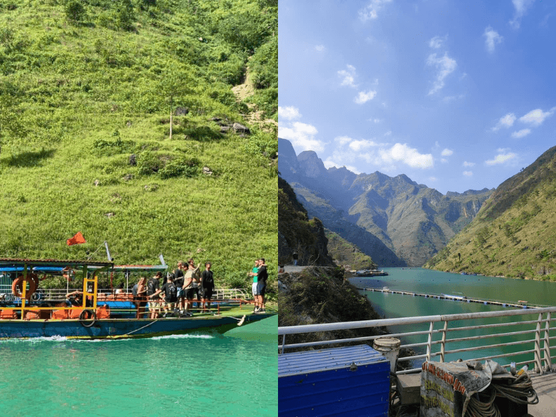 Thuyền bắt đầu xuất bến khoảng 15-20 phút sẽ dừng lại và đứng yên một chỗ. Đây là lúc chúng ta sẽ thật sự được đắm chìm trước vẻ đẹp của thiên nhiên. Cảm giác đứng trên thuyền và thưởng ngoạn toàn bộ bức họa xinh đẹp hòa quyện của sông núi,hít thở bầu không khí trong lành,tinh khiết,trong lòng bạn sẽ thấy an yên,thoải mái biết bao nhiêu. Hà Giang đẹp thế này,làm sao mà không yêu cho được!